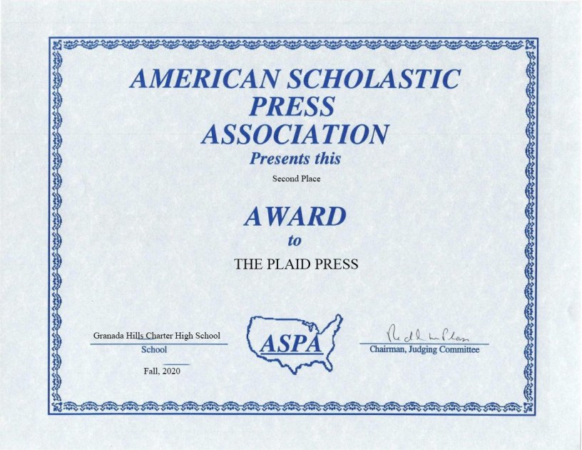 The American Scholastic Association awarded the Plaid Press Second Place in its annual newspaper review and contest.