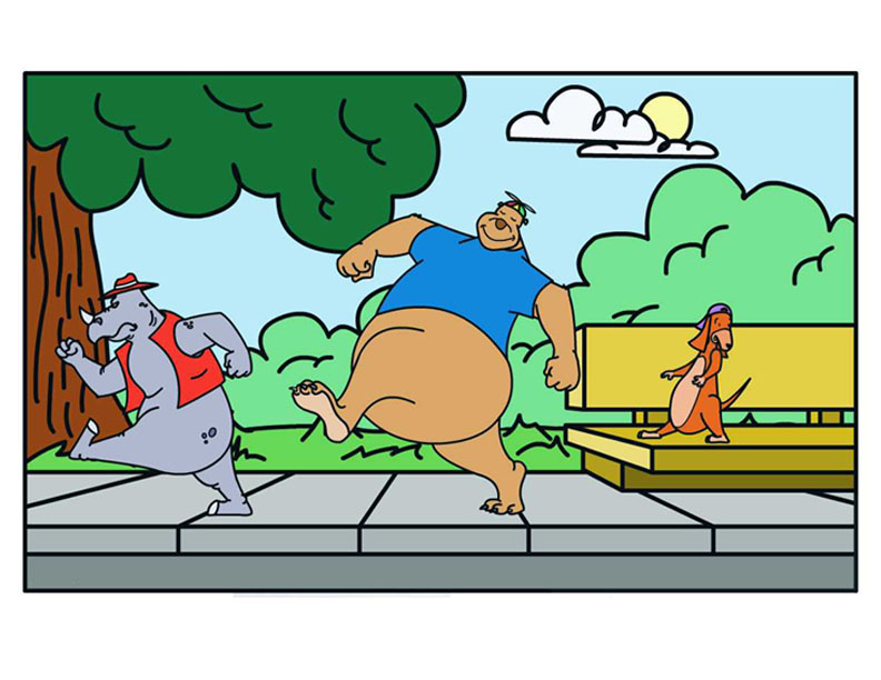 He has created a group of characters that he named “Roxy’s gang.” Roxy’s gang consists of Roxy the Rhino, who is the leader of the group; Mick the Bear, who is the muscle of the group; and Tommy Dachshund, who serves as comic relief and was inspired by Pinto’s dog.