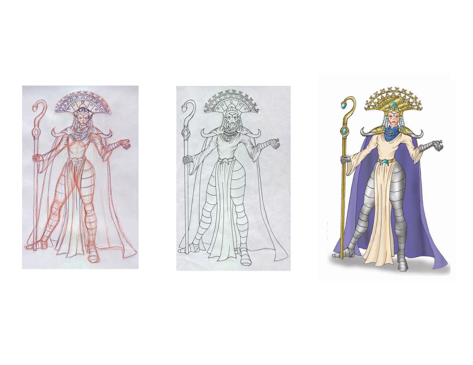 In his own artwork, Pinto always starts off with a rough light drawn sketch. Then, he contours the lines of the body and draws the details like facial features and clothing on the characters.