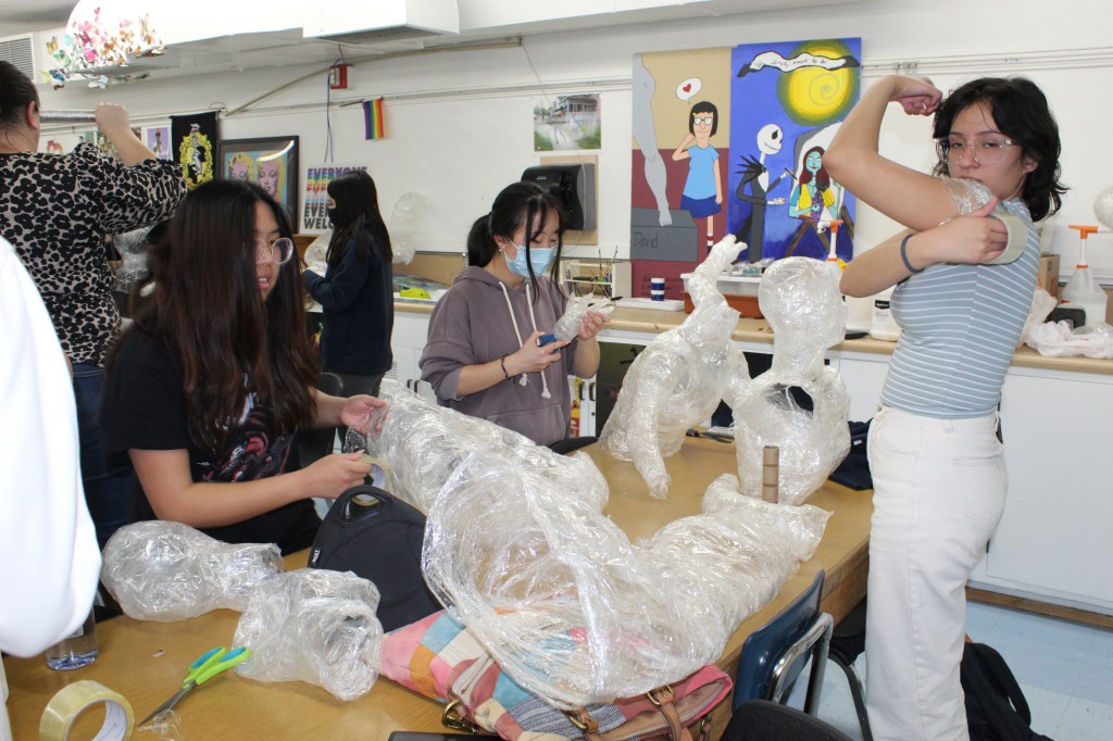“The thing that I love about this art project is that we have been able to create molds of our own bodies,” senior Tala Ahmadie said. “We feel really attached to the piece because it is so personal to each of us. The whole process has been super fun. My friends have wrapped me and I’ve wrapped them and it’s made us feel closer to each other. Mrs. Thomas especially has been very helpful and supportive of our ideas. She’s the best art teacher ever. I haven’t had an art class since eighth grade and the fact that she puts so much work into organizing these projects for us has made me excited about art again.”