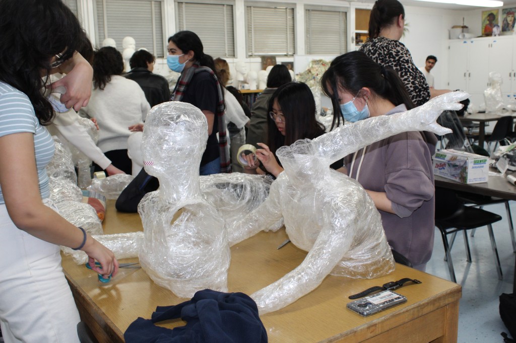 Throughout the school year, students have been working within a theme, in this particular extension students came up with expressive poses in order to communicate their themes. Originally unknown to the students, the project was to recreate the poses and create a cast of themselves executing it by wrapping themselves in plastic wrap and tape. The finished projects will be part of the student’s displays at the art show during Open House.