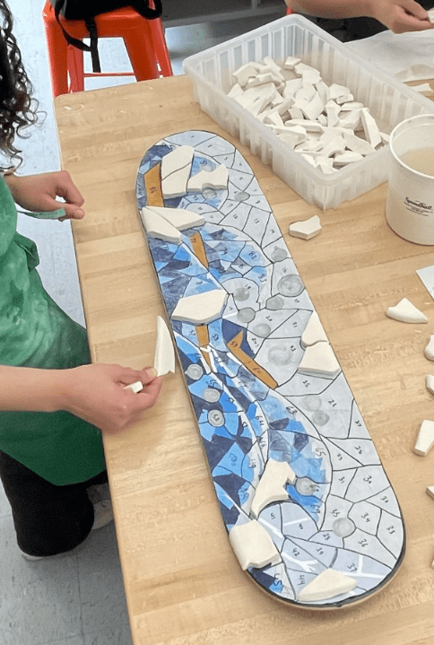 Once the tiles are glazed and fired, the students will adhere them to the wooden deck using mastic. After letting the tiles dry, the students grout the gaps of all tiles, making this the last step in creating a ceramic skateboard.