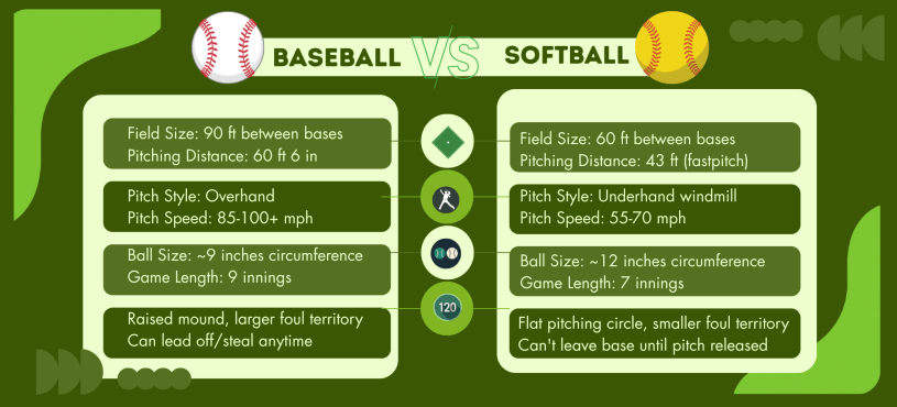 Softball differs from baseball in several key ways. The field is smaller, with 60-foot base paths, and pitchers throw from flat ground rather than a raised mound. The ball itself is larger, softer, and bright yellow, while games are played in seven innings instead of nine.